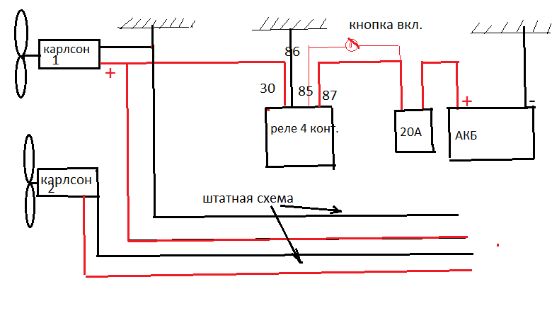 « Последний ответ от лесник 83 Сегодня в 00:58:05 »Нормальная схема. Будет работать. 12х20=240Вт. Какой мощности вентиляторы ?Нивовская спарка, пока данные только по штатным предохранителям 2шт.Х 20А максимальный ток и щёлкнуло похоже реле, отказала принудиловка. Темно было, разбираться буду завтра. Штатная схема осталась в работе.