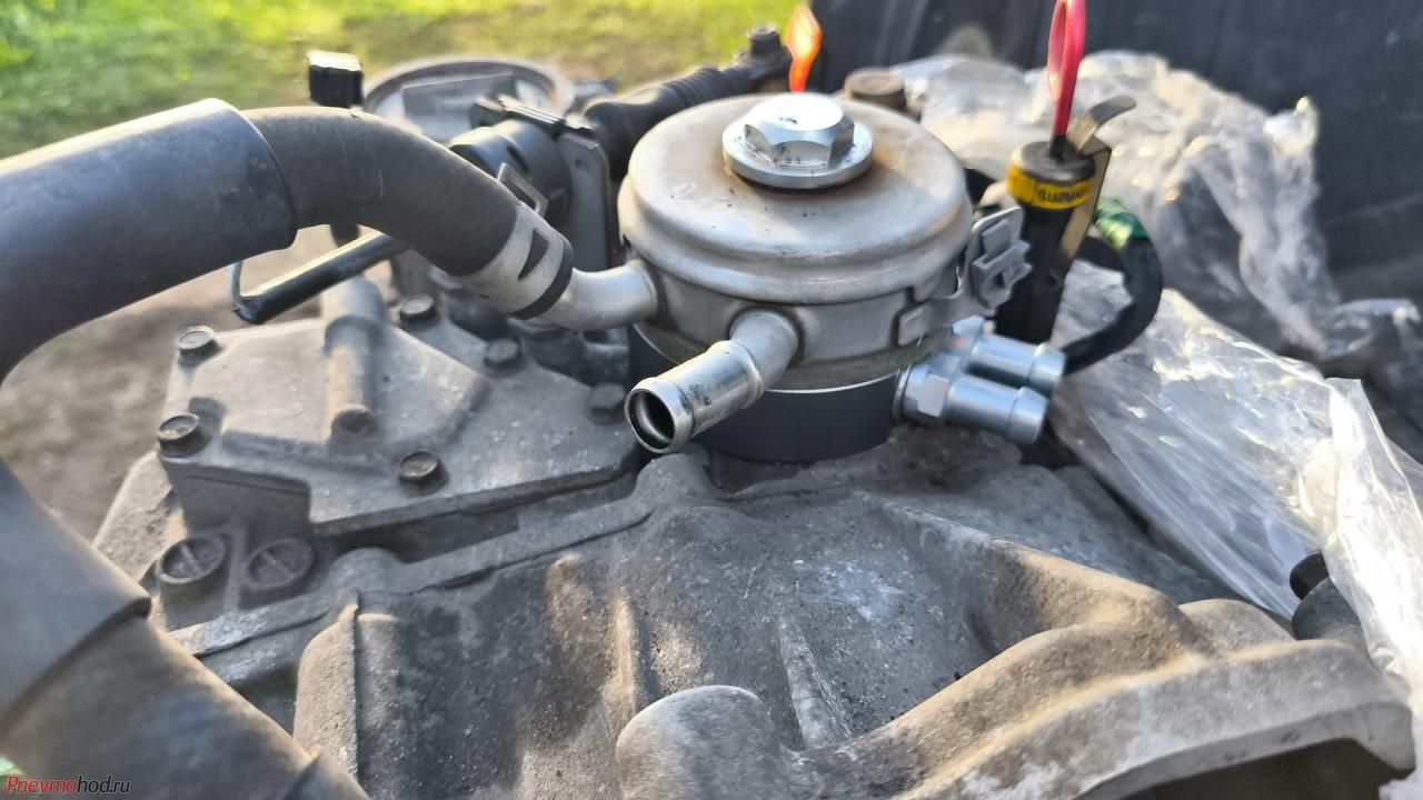 Выше этой "блямбы"есть устройство уже с подводом шлангов ОЖ, у меня они идут на печку салона. Сфотать это можно только разобрав верх навесного.. не буду))