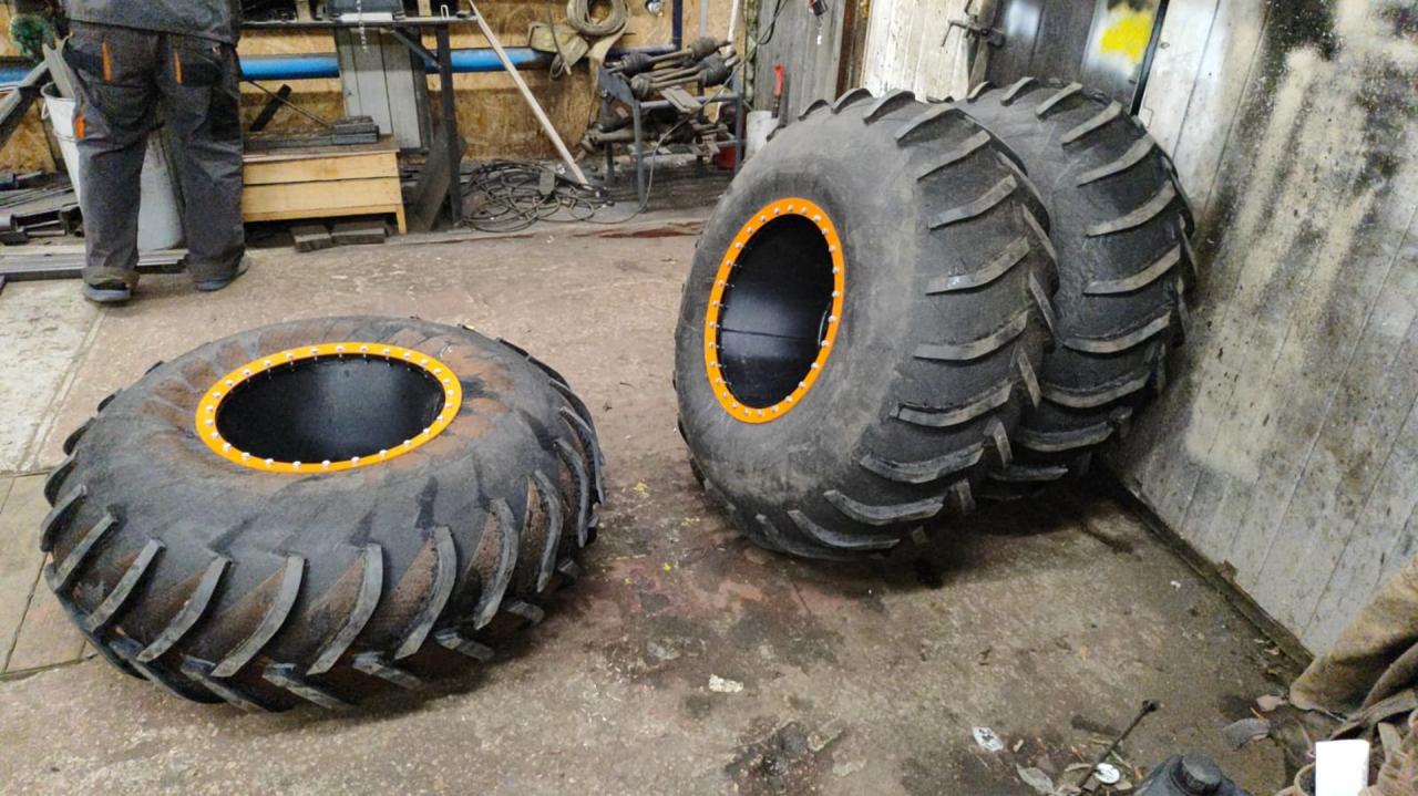 Для ОИ-25 часто берут диски шириной 400 мм (между несъемными кольцами бедлока). Объем колеса получается больше литров на 50, чем на обычных дисках шириной в 300 мм. В ненакаченном состоянии колесо выглядит неказисто, видно что диск слишком широкий. В накаченном состоянии все приходит в норму, как будто так и надо. Размер колеса (особенно диаметр), зависит от того, кто и как обдирал. Обычно это 1100-1150 мм диаметр и 430-450 мм ширина. На узком диске диаметр будет побольше, а ширина поменьше.