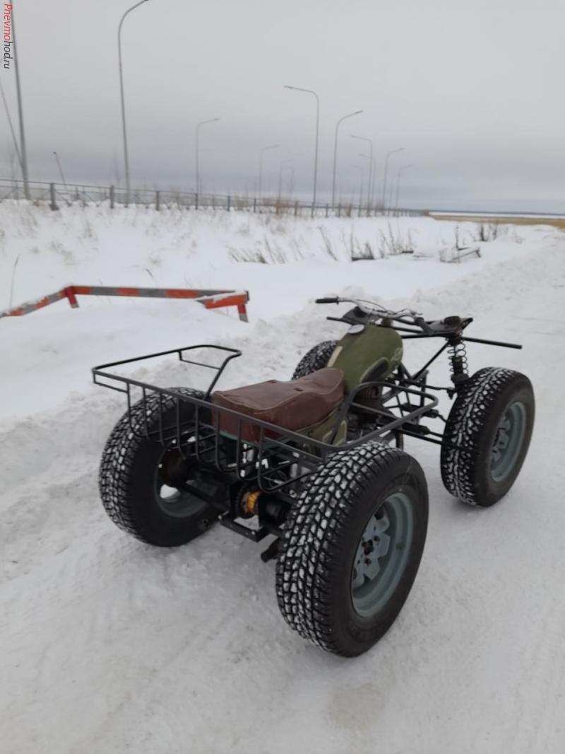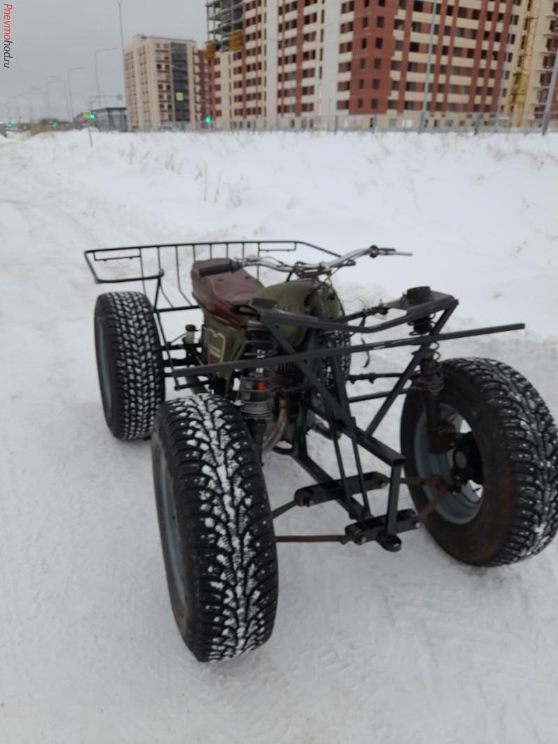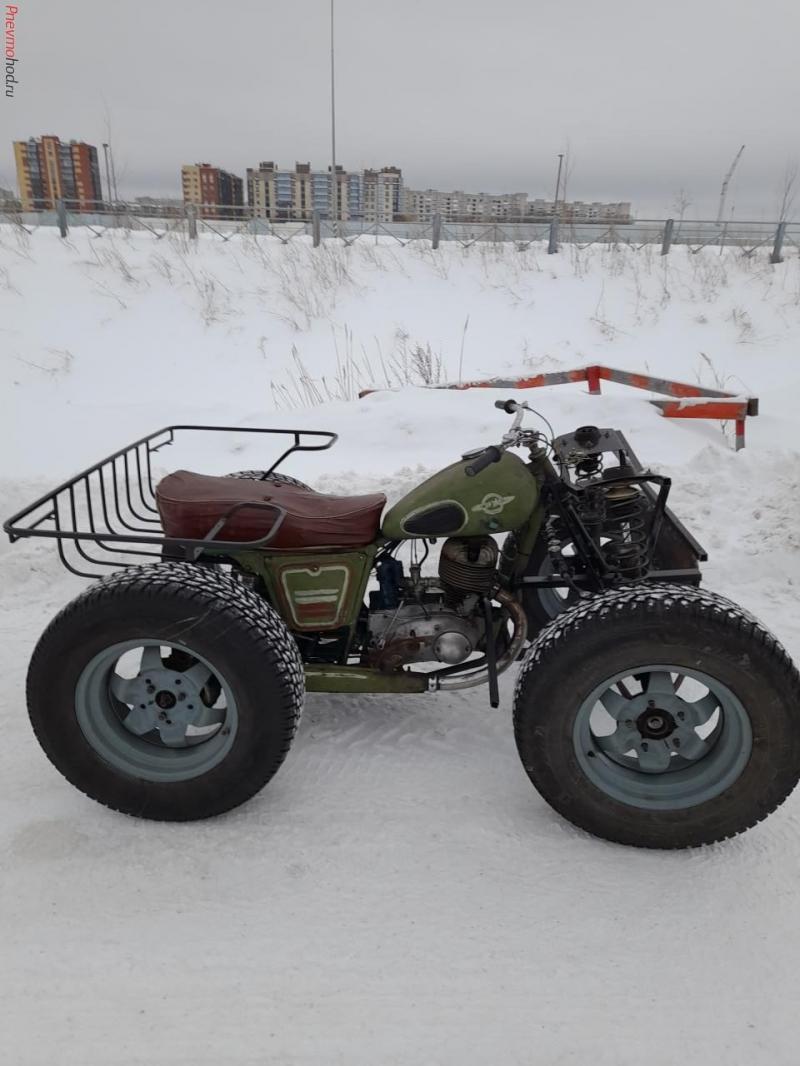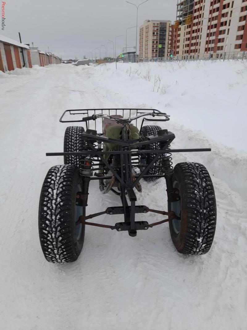 Из предоставленного заказчиком мотоцикла ИЖ-56 изготовил квадрик. Передача на задний мост цепная двухступенчатая, на дифференциал, шрусы, ступицы от ОКА, Колеса 16 дюймов, стойки передние от ВАЗ, пружины на заказ более мягкие чем родные ВАЗ. Осталось поставить крылья. Сделал пробный выезд, едет и рулится нормально.