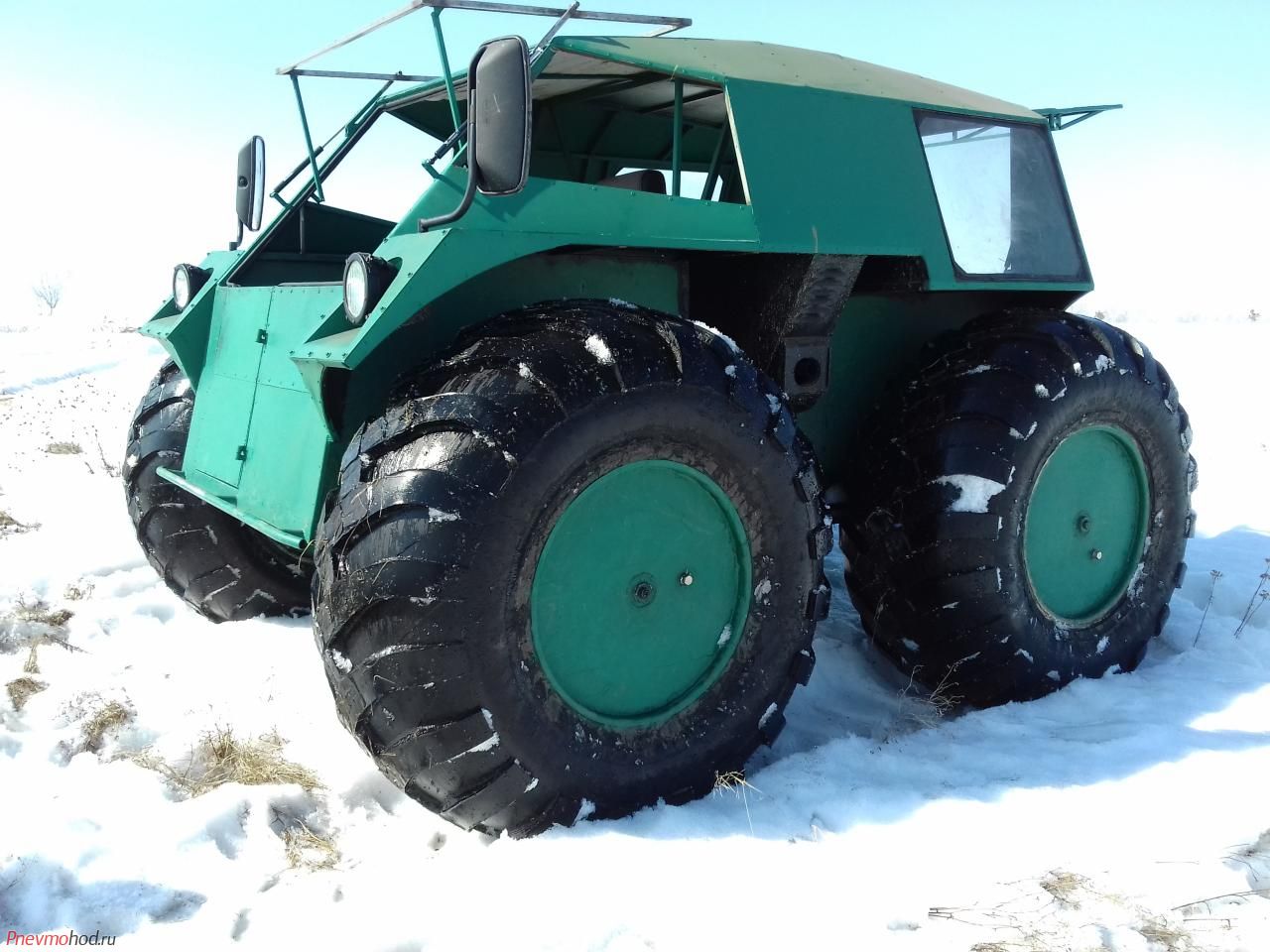 Центральная подкачка всех четырех колес выхлопом за 20 сек,двс дизель 2л ом 615 мерседес,кпп ваз 2108 4 ст,скорость максимала 20 км,увеличить максималку можно путем уменьшения колесных звезд,колесные цепи шаг 25,от кпп до МП кардан,бак жигули классика,кабина клепаная металл 0.8,боковые и задние стекла сталинит,лобового нет.
